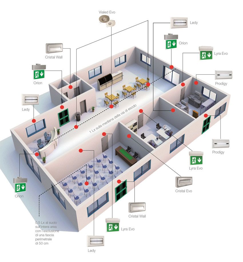 En cas de coupure de courant, il prend le relais de l'éclairage principal et éclaire les voies de sortie, guidant les personnes vers les issues de secours.